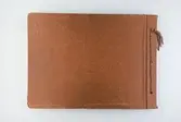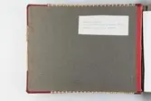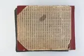 Fotoalbum med rød rygg og hjørner, stripete papir på forsiden og baksiden.