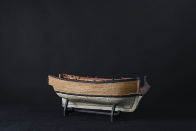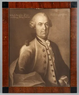 Porträtt i olja inom ram i svart färg med bronserade ränder, efter fotografi av oljemålning av skeppsbyggmästare Gilbert Sheldon.