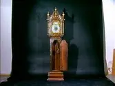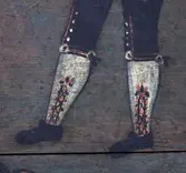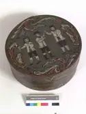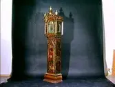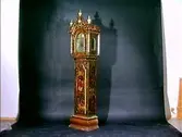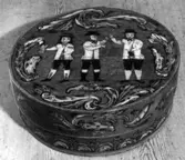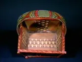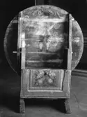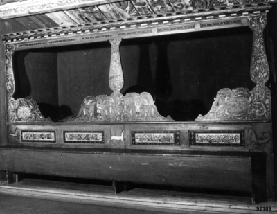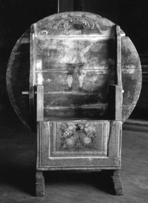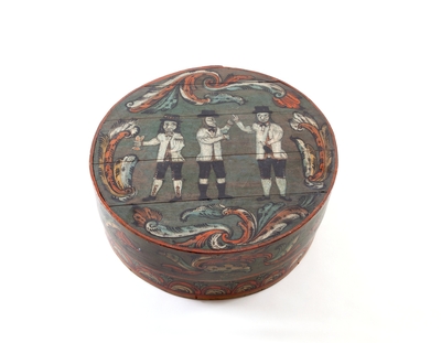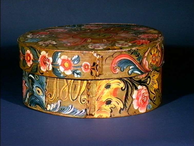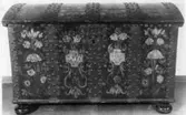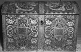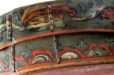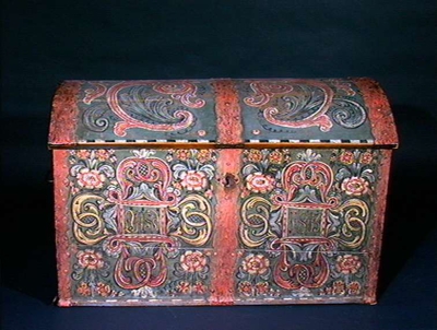 Kiste med buet lokk og heldekkende rosemaling, hvorav mye er senere tilføyelser eller restaureringer. Kulebena er også sekundære.