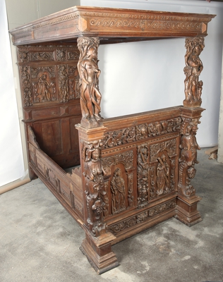 Himmelseng i fem deler, sidevanger, kortsider og tak. Kortsidene er rikt utskåret med Adam og Eva som sengestolper i front. Flere figurer og ornamentale utskjæringer.