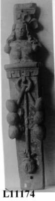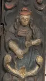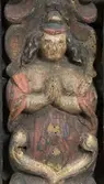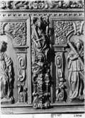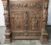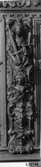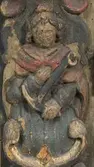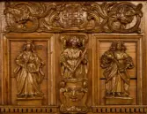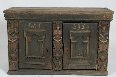 Skap med to dører. Skåret dekor, tre firgurer, en med slange i hendene, en med hendene i bedeposisjon, en med anker – representerer trolig hhv. visdom, tro og håp og visdom (tre av...