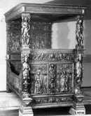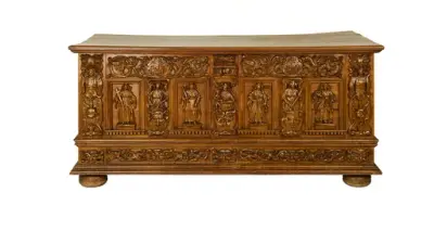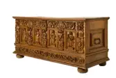 Kiste av eik, dekorert med skåret ornamentikk og figurscener i høyt relieff. Den er inndelt i tre felter, og hviler på fire flattrykte, kuleføtter. Nedre del består av profilerte l...