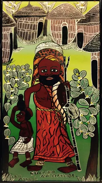 "Sultan na mjomba" (Sultanens morbror). Bildet viser en stor mann midt i bildet. På hans høyre side står en mye mindre mannsfigur. Den store mannsfiguren bærer en rustrød drakt, som blir holdt på plass av et belte i livet. Hans venstre hånd holder på en stokk (herold-stav) og han har en flaske/krukke rundt samme arm. Over sin venstre skulder har han et tøystykke (?) av lys-rød farge. Høyre hånd hviler på den mindre figurens hode. På hodet har han turban, først rust-rød, på toppen er den hvit. Den lille figuren bærer en krukke på hodet, og har et hvitt lendeklede rundt livet. Figurene er omkranset av trær med runde hvit-grønne blad og gule bær. Øverst sees 5 brune hytter med brune tak.
