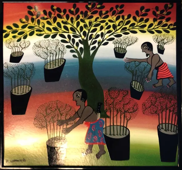 2 menn som høster inn. Det er 9 store krukker som det er korn/planter i. Disse krukkene er plassert rundt omkring på hele bildet. I midten er det et stort tre som har olivengrønne blader og gule bær/frukt. Den ene mannen står litt høyt oppe til høyre i bildet. Han har et rødt tøystykke rundt livet. Han holder rundt aksene (?) til en av krukkene. Den andre mannen står midt foran det store treet. Han har et blått tøystykke rundt livet med rødt mønster på. Han har stukket en kniv ned i tøystykket bak.