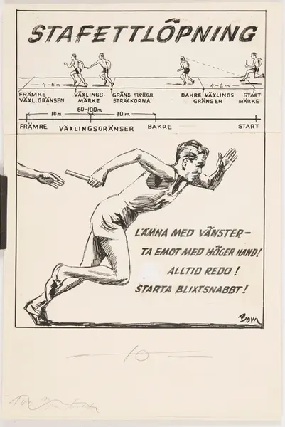 I bildens nedre halva springer en man som precis tagit emot en stafettpinne. Intill står texten "LÄMNA MED VÄNSTER - TA EMOT MED HÖGER HAND! ALLTID...