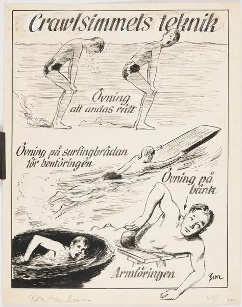 Bildens nedre halva illustrerar "Övning på surfingbrädan för benföringen". En man crawlar i ett vatten, en annan håller i en surfingbräda och simmar med fötterna i ett vatten, en tredje man ligger på mage på en bänk och övar på armföringen.