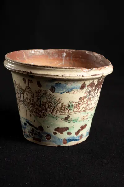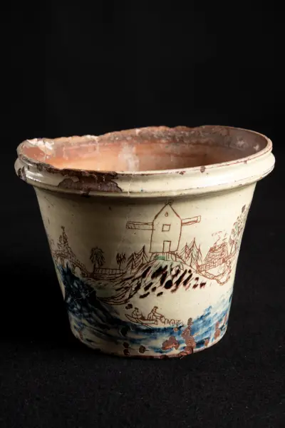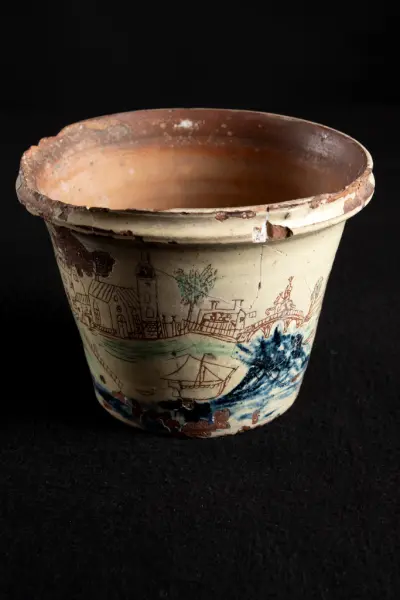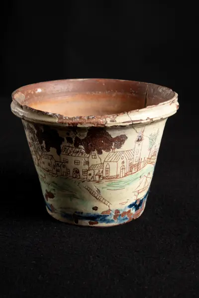 about Kruka av gulglaserad lera med inristat och rödtecknat motiv från Karlstad, allt naivt återgivet som en barnteckning. Krukan saknar fabriksmärke. Trasig men lagad. Tros vara tillverkad i ett gammalt pottmakeri i Karlstad.