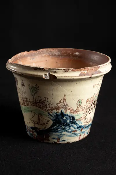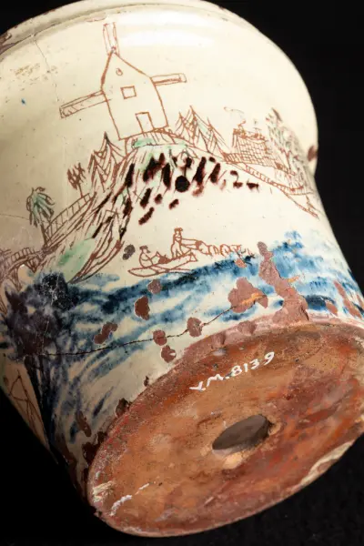 Subject Motivet föreställer Västra bron i Karlstad och därpå en ridande husar. På andra sidan bron syns värdshus, domkyrka samt några större och mindre hus, en trädgårdsmästare och på fältet framför ett par kvinnor i arbete, därefter på en kulle, omgivet av träd ett kupoltäckt, vimpelprytt torn - Hybeleiens kvarn?. Därefter en fiskande man nedanför ett hus samt på en kulle en väderkvarn. Vid älvstranden nedanför två män i en båt, den ene lägger ut ryssja. Därpå följer Västra bron. Under denna och nedtill på krukan forsar blått vatten, Klarälven.