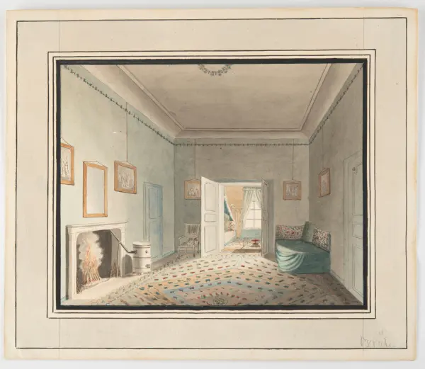 Interiör i högreståndsmiljö. Perspektivet uppritat med linjal och blyerts, kolorerad med akvarell. Ett rum med öppen spis, en soffa och konst på väggarna. Innanför det yttersta rum...