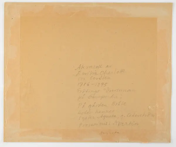 Subject Interiör i högreståndsmiljö. Perspektivet uppritat med linjal och blyerts, kolorerad med akvarell. Ett rum med öppen spis, en soffa och konst på väggarna. Innanför det yttersta rummet ligger ytterligare ett med en säng och ett bord, i fonden ett fönster. På väggen bredvid fönstret hänger några vapen.