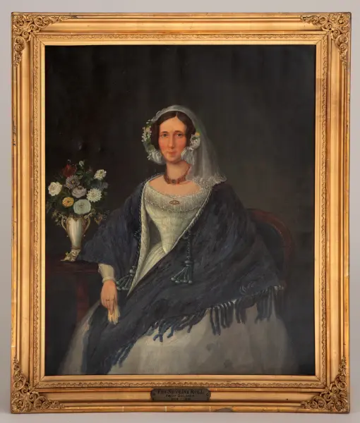 - Portrettet viser fru Nicoline Roll, født Selmer (1802-1891), som var Jacob Roll Knagenhjelms mormor. Hans morfar, Jacob Nielsen Roll (1783-1870) er portrettert i NK1916-095. Nicoline Brog Selmer var gift med Jacob Nielsen Roll (avbildet på NK1916-095) og fikk fire barn. Et av barna; Selma Angelique Louise Roll (f. 1835) giftet seg med Ludvig Wiese Knagenhjelm (1924-1907). De var Jacob Roll Knagenhjelms foreldre.