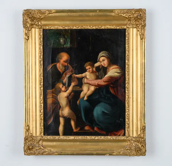 Konstverket är målat på Stockholms slott 1851, av Wilhelmina Lagerholm, och är en studie av ett konstverk som troligen visades på slottet under denna period. Konstverket föreställer med stor sannolikhet The Holy Family with the Infant Saint John the Baptist av Domenico Zampieri (Domenichino) som var verksam i Rom (född 1581, död 1641).