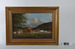 about Skåningsfossen i Tista, sett fra sør. Oljemaleri viser elven, bruksbygninger og bolig, med fjell i bakgrunn. To mann og båt i forgrunnen. Viser møllebruk og sagbruk. Ramme konveks buet ramme med riller, overmalt med gullmaling.