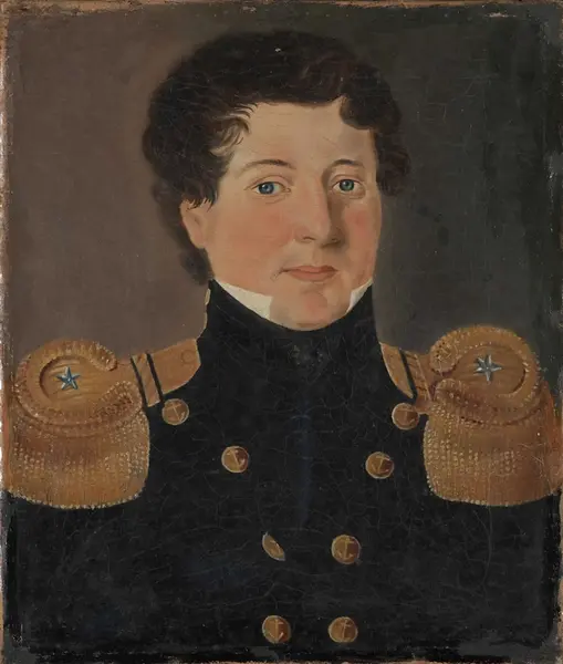 Brystbilde, en face. Hår brunt, børstet framover. Ansikt rødmusset. Øyne blå. Gråhvit fadermorder. Mørk blå uniformsjakke med høy enkeltkrage med to knapper på siden. Dobbelt rad med gule knapper med anker på foran. På skuldrene store gullepåletter med en stjerne på. Bakgrunn grå på høyre og brun på venstre side.