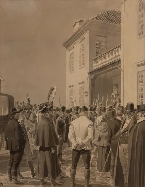 Bildet skildrer en scene fra Eidsvoll i 1814. Vi befinner oss utenfor Eidsvollsbygningen, og all oppmerksomhet rettes mot mannen som er i ferd med å gå inn hovedinngangen. Mannen e...