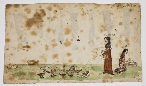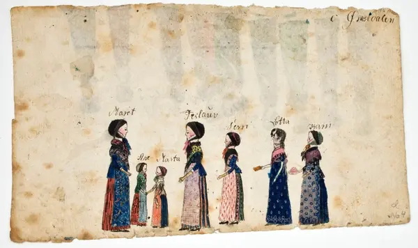 13 fargelagte tegninger (tegning/akvarell) utført av Christiane Charlotte Elster. Hun bodde i denne perioden i Inderøy.- KunstnerElster, Christiane Charlotte