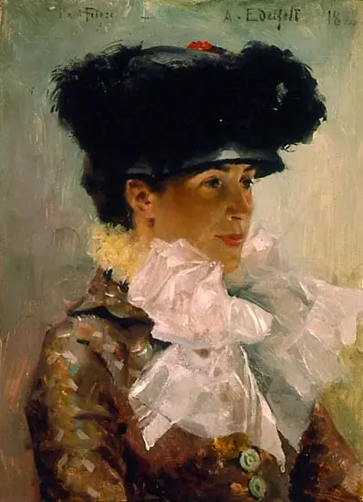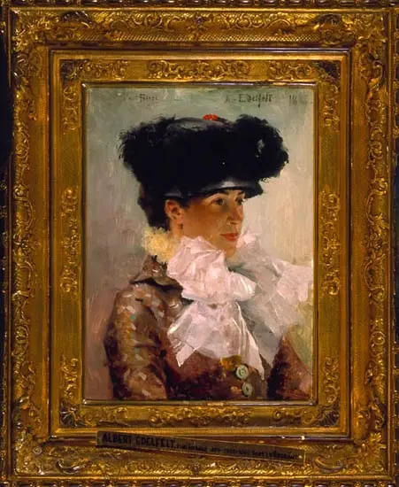 Porträtten kan dock i sig själva berätta en del om kvinnorna. Bara det faktum att de är avporträtterade av sin tids mest efterfrågade konstnärer betyder att de tillhör det högre borgerskapet. Porträttet på fru van Landsbergen är förmodligen beställt och överensstämmer med de ideal som fanns för porträtt vid den här tiden i Holland. Edelfelts porträtt kan vara ett vän- eller kamratporträtt. Kanske är kvinnan på porträttet själv konstnär, eller hustru till någon av Edelfelts konstnärsvänner. Porträttet ska se ut som om det vore en ögonblicksskildring och intentionen har varit att göra ett realistiskt porträtt. Så här såg hon ut, kan vi tänka oss. För kompositionen har konstnären självklart fascinerats av hennes klädsel, den stora vita ryschiga rosetten som hon bär runt halsen, den svarta hatten med svandun och den röda nejlikan som mycket raffinerat skymtar högst upp, och som blir till en röd upphöjande accent i bilden. Hon ser ut att var klädd för en söndagspromenad, fast med sin raka hållning verkar hon snarare sitta på en kuskbock, eller i en sadel, men till det sistnämnda stämmer inte klädseln.