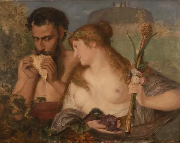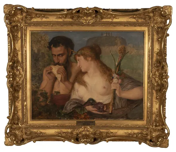 Vi ser Nymf och Faun, två erotiska väsen ur den romerska mytologin. Faunen har här små horn i pannan, blåser i en flöjt och tittar illmarigt på nymfen. Flöjten, fallisk i formen, anses symbolisera känslorus och förförelse. I regel avbildas fauner med bockhornsfötter och svans, det djuriska draget betonas. Han har mörkt hår och ett rött skynke svept kring sig, det röda associeras till kärlek-passion. Nymfen är vithyad, har lång blont hår och ett silvrigt skynke om midjan. I ena handen håller hon ett fat med druvor, som för tankarna till berusning. I den andra handen håller hon en blomsterstav, en fallisk fruktbarhetssymbol. Bakom dem höjer sig en kulle med ett tempel - är det gudarnas parnass? En vinranka flätar samman paret och den och druvorna alluderar till berusning.