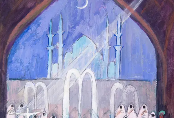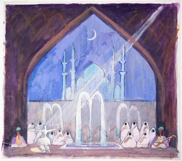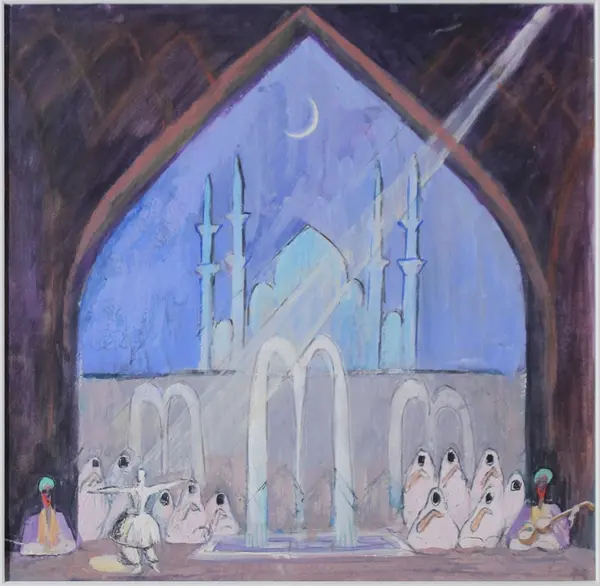 Kan vara skiss till ett sceneri för en teaterscen, formen på kulissen och ljuset från strålkastaren påminner om Grosvalds skildringar av basarer och hamam. Personen till vänster dansar en dans karaktäristisk för sufismen.