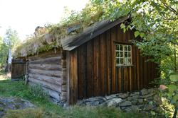 Mountain hut from Rennsenn: Built around 1700, rebuilt at Valdres Folk Museum in 1956, the hut is from the Rennsenn mountain area in Øystre Slidre. Often farms would have two mountain farms, one in use in early summer / early autumn and a more distant one for most of the summer, in order to maximise grazing and hay production. This hut was from the more distant mountain farm for the Eikra farm, and, from around 1870, for the Løvås farm. The living quarters and milk storage are separated by a corridor in the middle. In the hut, there is a fireplace with a chimney crane for lowering, raising and swinging cooking pots over the fire, bed, table, and shelf for plates, dishes and bowls. In the milk storage room, there are shelves with various milk containers. In the corridor, there is fastening for a cow. Often, the cows would be led into the corridor one by one to be milked. Originally, one could pass through the corridor with a gate or a door at each end of the corridor. Marit and Ola N. Strande bought the mountain hut with its furnishings and contents in 1956 and then gave it all to the museum. The site it was moved to was so steep one door had to be walled up.
