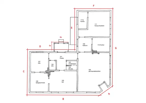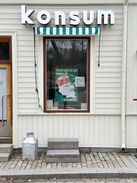 - BygningKonsumbutiken är ett rum med golv av röd klinker, vita väggar som är klädda i vitt kakel samt tak av vitmålade gipsskivor. Ut mot gatan gapar ett stort skyltfönster för marknadsföring av varor. I rummet finns fast möblering i form av väggfasta hyllor och exponeringsyta invid fönster, försäljningsdiskar, samt ett inkaklat kylkar. Murstock finns, samt radiator. Inom rummet ryms även ett avdelat baklager/kontor (SKABYG.10101_111a). (SKABYG.10101_111)