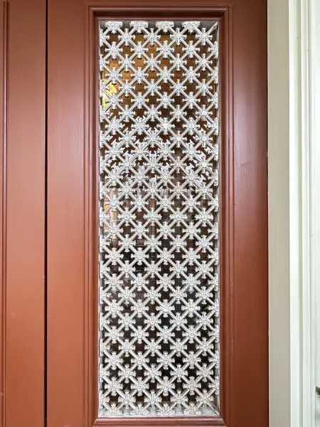- BygningSalen är ett rum med fernissat brädgolv, tapetklädda väggar samt pappspänt och vitmålat tak. I rummet finns det två fönster som vetter mot gatan, samt dörröppningar mot farstun och sängkammaren. En vit kakelugn med eldstadsplan av stenplattor pryder rummets ena hörn. För värme finns dessutom gjutjärnsradiatorer installerade under fönsterna. (SKABYG.10101_105)