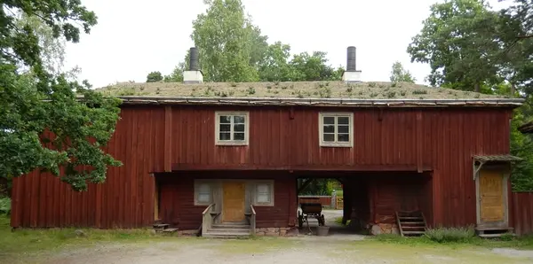 Grund av kallmurad huggen natursten. Under AF-knut är inlagt en stor järnbit. Liggtimmerstomme. Dubbelhaksknut, vissa knutrader inklädda med knutlådor av bräder. Fasad delvis täckt av locklistpanel. Bottnar 19-32 cm. Profilerad locklist 7,5 cm. Målad med röd slamfärg. Portlider i riktning A-C. Valmat åstak. Tätskikt av näver täckt med torv. Övre och undre täckja i trä där den övre vilar i täckjekrokar av järn.