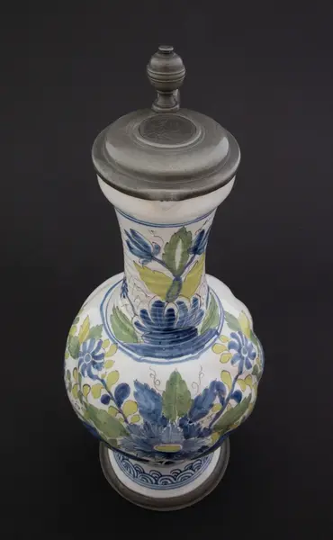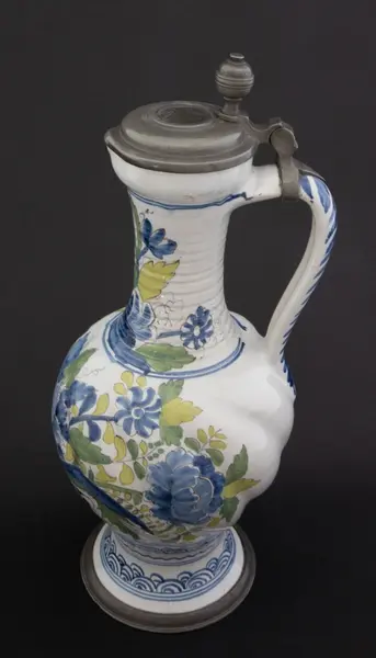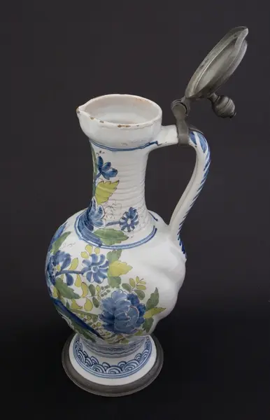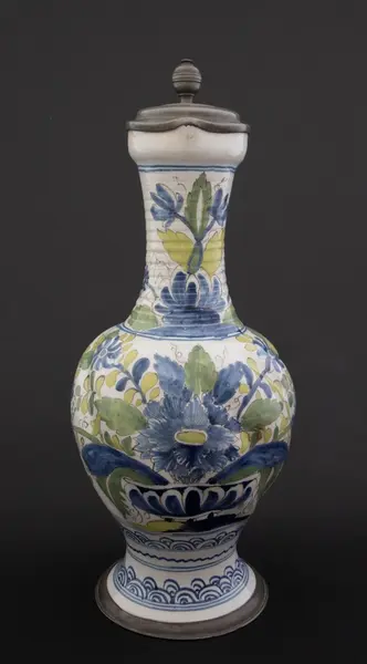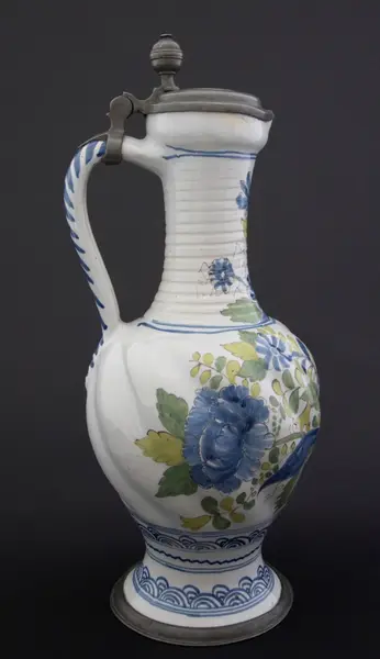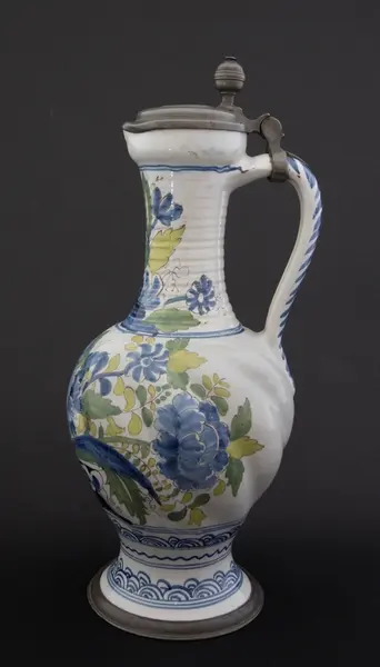 Kanne i dreid leirgods. Høy utover brettet fot med tinnkant. Rundt korpus med bukler og lang hals med riller. Polykrom dekor i duse farger. Dekor med blomsteroppsats på korpus og blomster på halsen. På foten et asiatisk inspirert bølgemønster. Fot, korpus og hals er hver "innrammet" med koboltblå konsentrisk sirkler. På toppen e... Kanne i dreid leirgods. Høy utover brettet fot med tinnkant. Rundt korpus med bukler og lang hals med riller. Polykrom dekor i duse farger. Dekor med blomsteroppsats på korpus og blomster på halsen. På foten et asiatisk inspirert bølgemønster. Fot, korpus og hals er hver "innrammet" med koboltblå konsentrisk sirkler. På toppen et tinnlokk som er lagd for kannen. Lokket har et myntavtrykk med portrett av Karl VII i profil og innskriften Carolus VII D. G. ROM. IMP. EMP. AVG. Dette er en forkortelse for Carolus VII. Dei Gratia Romanorum Imperator Semper Augustus.