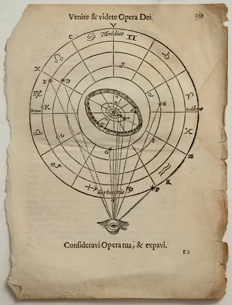 Den ene siden viser et sirkulært diagram med konsentriske sirkler og tverrlinjer. I ytterste sirkel er symbolene for stjernetegnene. Under diagrammet er det et øye, hvorfra det stråler stiplede linjer som ender på ulike punkter.