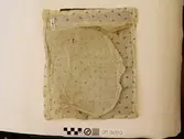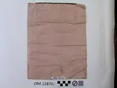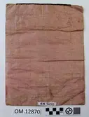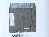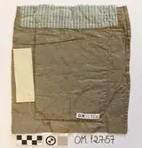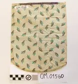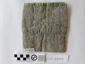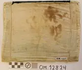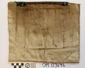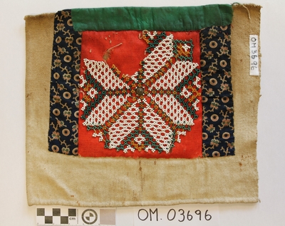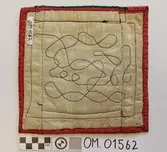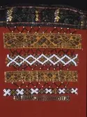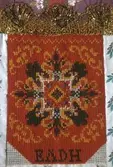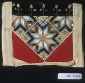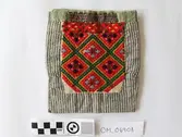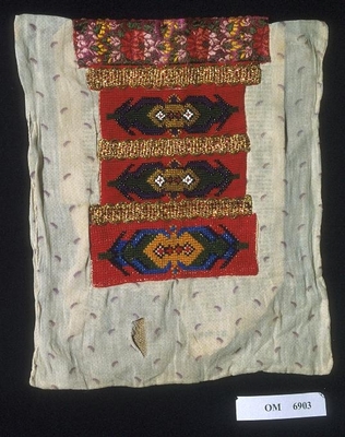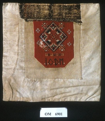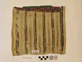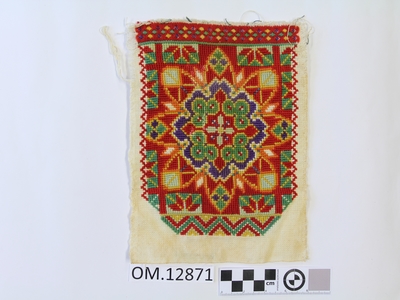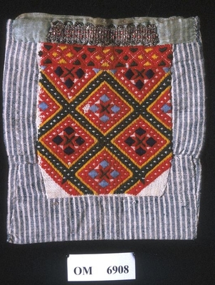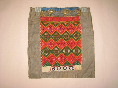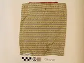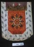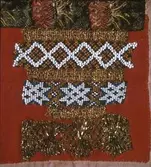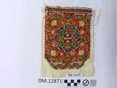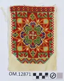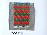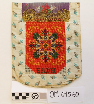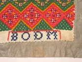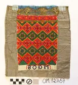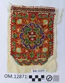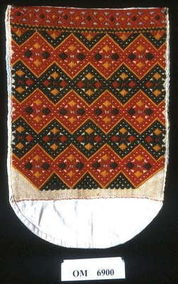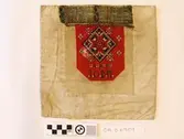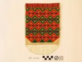 Brodert med ulltråd på linstoff sydd på eit bakstykke av bomull. Bakstykket er blå- og kvitstripete. Øverst ein lysegrøn, litt gjennomsiktig pyntekant. 8 cm lang og 1,5 cm breid st...