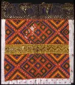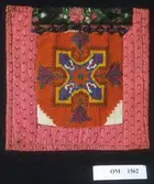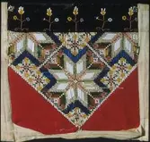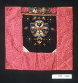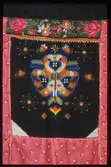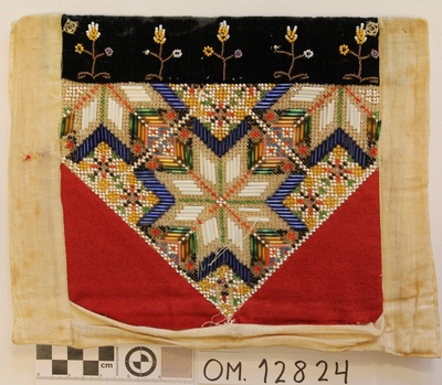 Kvadratisk bringeduk sett saman av fleire broderte border, brodert på stramei. Sydd på svart vadmelstykke, botnstoff. Kanta med eit farga bomullstykke. Raudt sikeband oppe (falma) ...