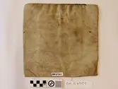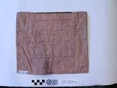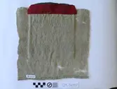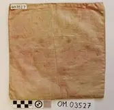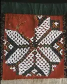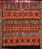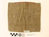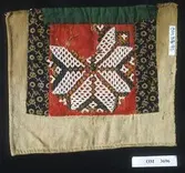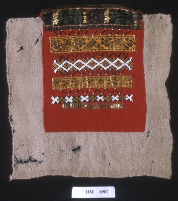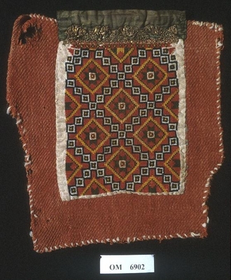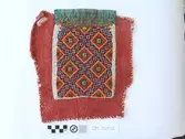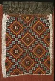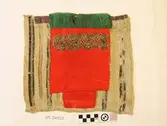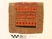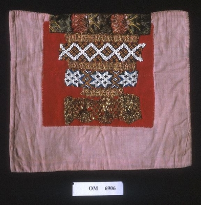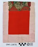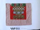 Raud, rektangulær brystduk montert på eit kypertvevd, kvadratisk ullstoff. Noko holete. Blomsterbord på silkekvarden øvst oppe, grøn hovudfarge. To perlevevde border og to metallbo...