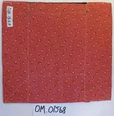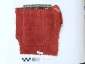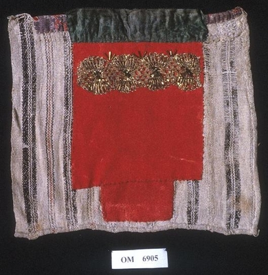 Rektanguler brystduk laga av eit stort stykke raudt klede og eit lite stykke raudt klede sydd på nedst på midten. Grøn fløyelskant oppe, og ei gullfarga metallbord sydd på det raud...