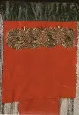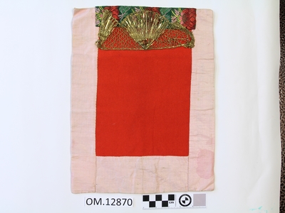 Rektangulær bringeduk med raudt ullstykke framme uten brodering. Oppe er det ein kant med gullfrga metallbord oppå eit brokadeband, metallborden går og eit stykke ned på det raude ...
