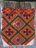 Brystduk sydd i halve krossting på stramei med svart botnfarge. Mynster i raudorange, grønt og gult. Oppå i midten er det perlebroderi med perler i blått, kvitt, svart, raudt, gull...