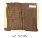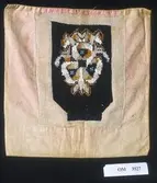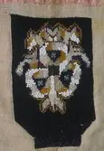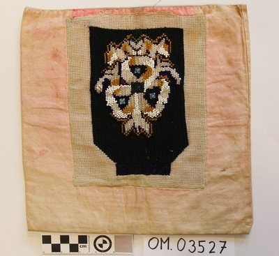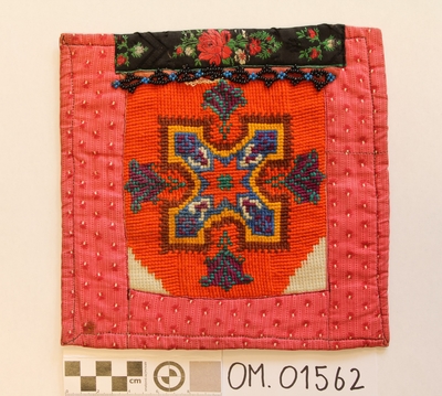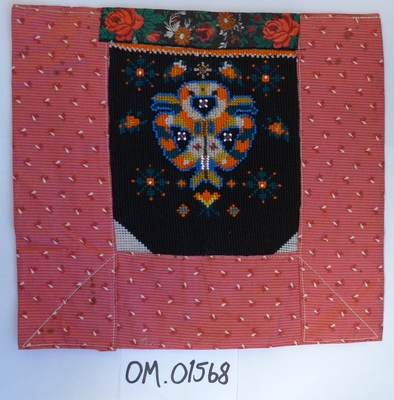 Form: rektangulær, ikkje kant oppe, men det er merke etter kant. Broderi sydd på stramei. Svart botn, påsydde perler i liljemotiv. Rosa, dobbelt bakstykke. Nedom det svarte broderi...