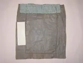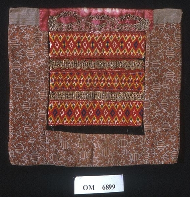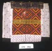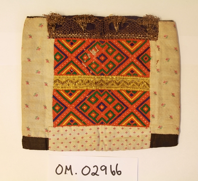 Rektangulær bringeduk med eit fargerikt tøystykke av silke. Lite raudt silkeband til kant oppe (falma). Metallblondekant oppå silkebandet. Sydd på bomullstoff i naturfarga med blåt...