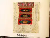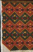 Rektangulær bringeduk med mønster sydd på stramei, halve kross-sting, tre like mønster-rapportar. Dei to øvste har same mønster med perlepynt. Den neste har og same mønster, men ik...