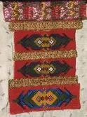 Silkeblomsterkvarde øvst med svart botn og raude blomster og grønne blad. Under den er montert ei remse svart og blått perle- broderi sydd oppå eit smalt, raudt silkeband. Broderi ...