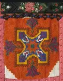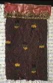 Brodert med ullgarn i plattsaum. Alt er handlaga. Hovudmotiv er små åttebladroser i border. Oppe er det påsydd eit blått silkeband med eit breitt gullband (i forgylt sølvtråd) utan...