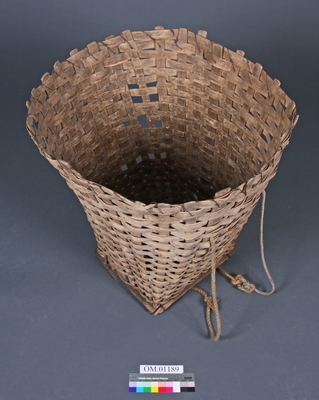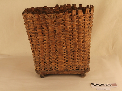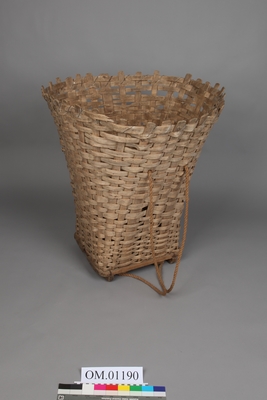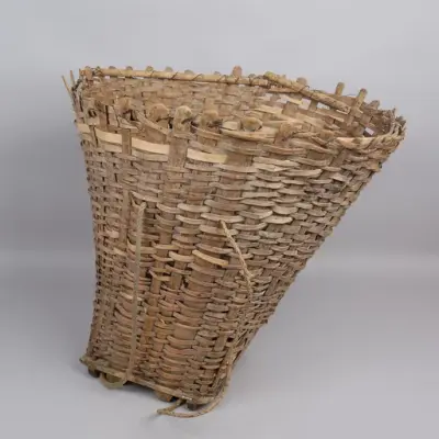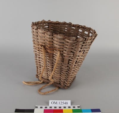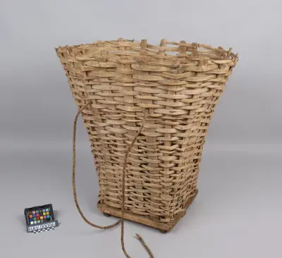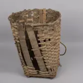 Møkkakipe av flettet treverk. Den er smal nederst og blir breiere opp mot toppen. Bunnen er rektangulær og av furu. Opp fra denne står det trespiler. Mellom disse er det flettet tr...