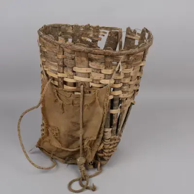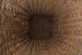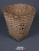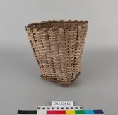 Lita barnekipe med tett fletting. Både breie og smale stakar. Tegene til flettinga er runde på utsida (halv grein). Den eine "foten" er borte. Lealaus og ein del avknekte tegeendar...