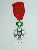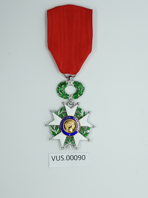 Medalje i sølv med rosett i hvit emalje på sølv bunn, rosetten har fem armer med tofliket ender med små sølvkuler på tuppene. Rosettens midt er en dyp blå sirkel med påskrift, og s...