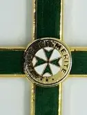Et likebeinet kors, der de fire amene stikker ut som trekanter, fram fra en sikrelplate i midten, bestående av tre sirkler. Korset er omkranset av to laurbærgrene, en nesten lukket...