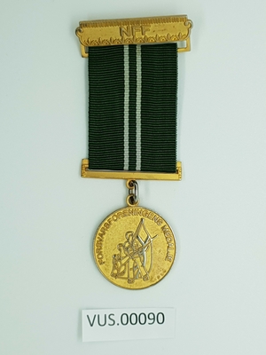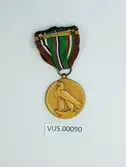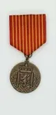 Medaljen er støpt medall og har preget forside med soldater, krigsskip og fly. Tekst over motivet. Medaljen er festet i silkebånd med grønn hovedfarge og flere stripfer. Stripene i...