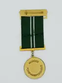 Gylden medalje festet med grønt sløyfebånd med to hvite, smale striper i midten. Nålen som festes til jakken er montert på en gylden plate med liljekant nederst og stolpekant øver...