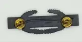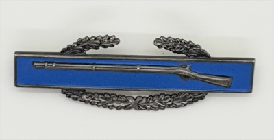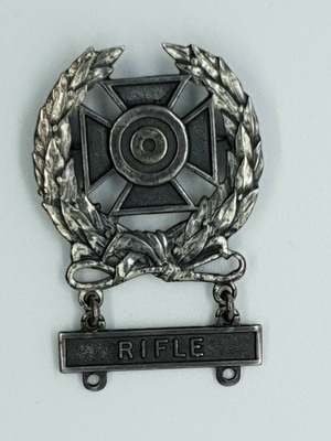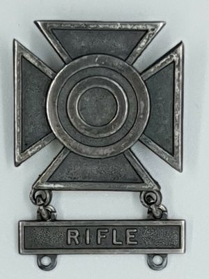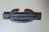 Jakkemerket er oksidert metall, en åpen laurbærkrans med et blått, emaljert rektangel over, og en rifle i samme oksiderte metall. Uniformsmerket festes som en pin med to pigger og ...