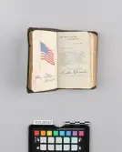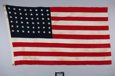 Stort, rektangulært flagg med tretten røde og hvite striper, samt 48 stjerner på blå bakgrunn i øvre venstre hjørne. Tilhørende flagget er en todelt flaggstang av tre og en massiv ...