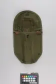 Militærgrønn feltspade og spadeveske. Feltspaden er av metall med skaft av tre. Spadebladet er brettet inn bak skaftet og har en skruelås. Spadevesken er av bomullslerret. Den best...