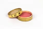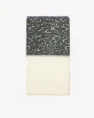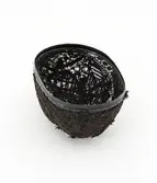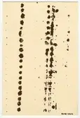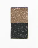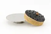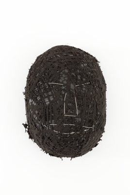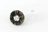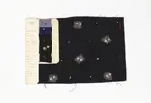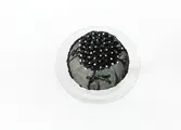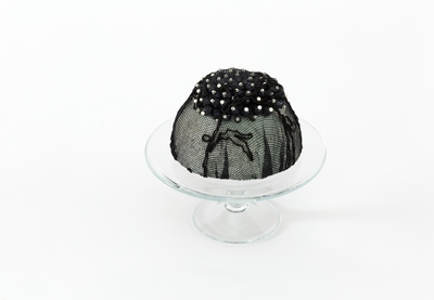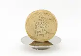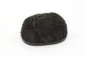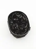 KLM 46157:28:1-2. Konstverk, papper, färg, metall, keramik, glas. Föremål tillverkat av papper med ovansidan målad i svart (:1). Dekorerat med svarta ovala stenkolsknappar, fastsat...